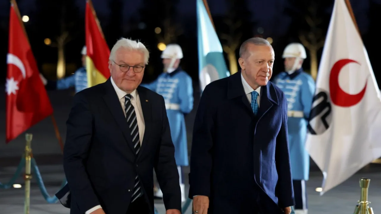 Cumhurbaşkanı Erdoğan, Steinmeier'i, Cumhurbaşkanlığı Külliyesi'nin giriş kapısında karşıladı. İki lider Türkiye ve Almanya bayrakları önünde fotoğraf çektirdi.