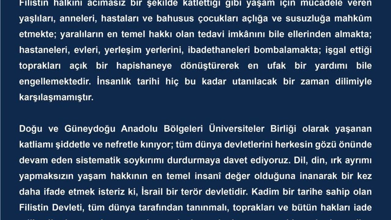 Doğu ve Güneydoğu Anadolu Bölgeleri Üniversiteler Birliği, İsrail’in Filistin’de sivillere yönelik saldırılarının insanlık onurunu hiçe saydığına dair ortak bildiri yayınladı. Açıklamada, İsrail’in uyguladığı şiddet ve işgal politikalarının dünya tarihinin en acı sayfalarından birini oluşturduğu ifade edildi. Kadınların, çocukların, yaşlıların ve hastaların açlık ve susuzluğa mahkûm edildiği, hastanelerin ve ibadethanelerin hedef alındığı hatırlatılarak, “İnsanlık tarihi hiç bu kadar utanç verici bir dönemle karşılaşmamıştır” denildi. Bildiriyi, Adıyaman Üniversitesi de destekledi.
