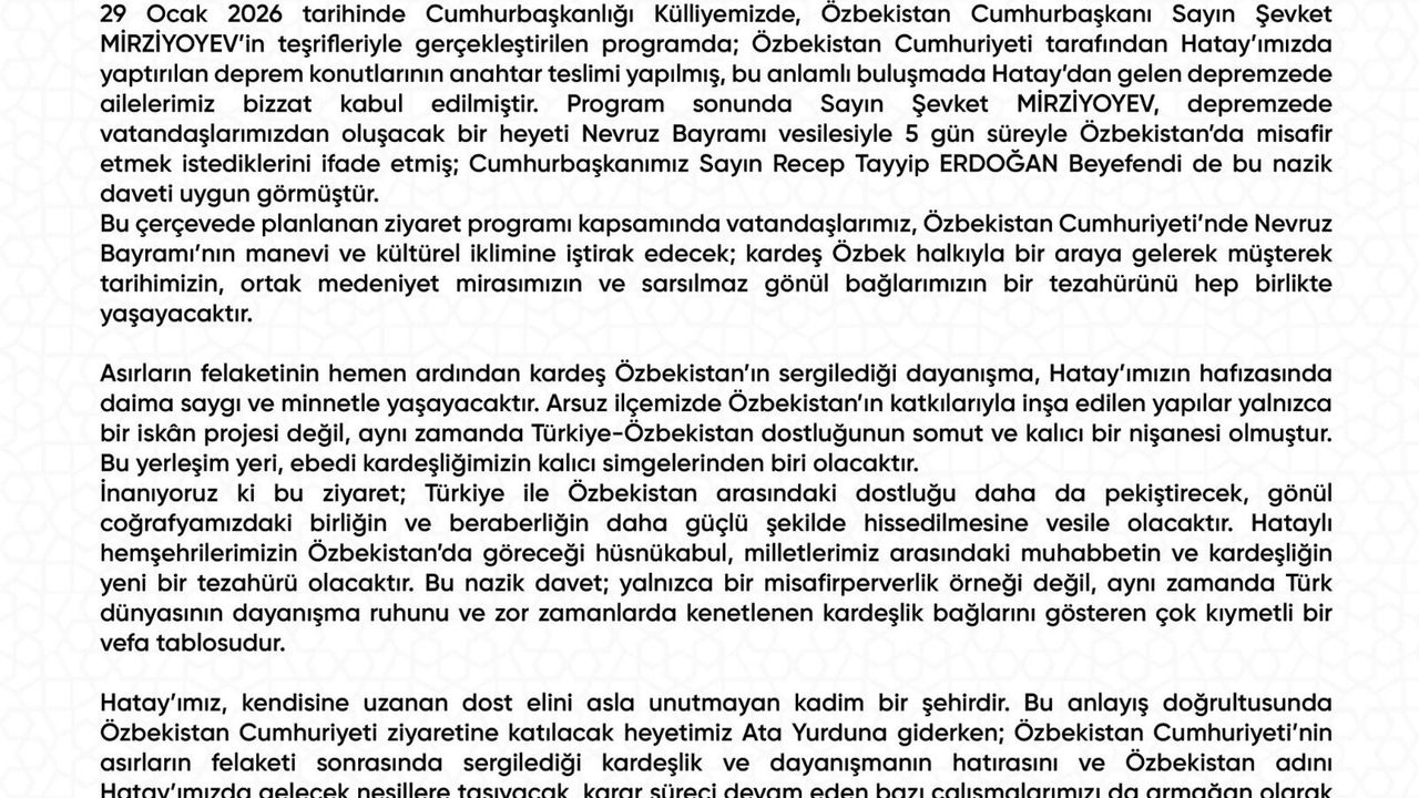 Cumhurbaşkanlığı Külliyesi’nde 29 Ocak 2026 tarihinde gerçekleştirilen programda, Özbekistan Cumhuriyeti tarafından Hatay’da yapılan deprem konutlarının anahtar teslimi yapılırken, Özbekistan Cumhurbaşkanı Şevket Mirziyoyev, depremzede vatandaşlardan oluşan bir heyeti Nevruz Bayramı vesilesiyle ülkesine davet etti. Cumhurbaşkanı Recep Tayyip Erdoğan’ın da uygun gördüğü bu davet kapsamında Hataylı vatandaşlar 5 gün süreyle Özbekistan’da ağırlanacak.