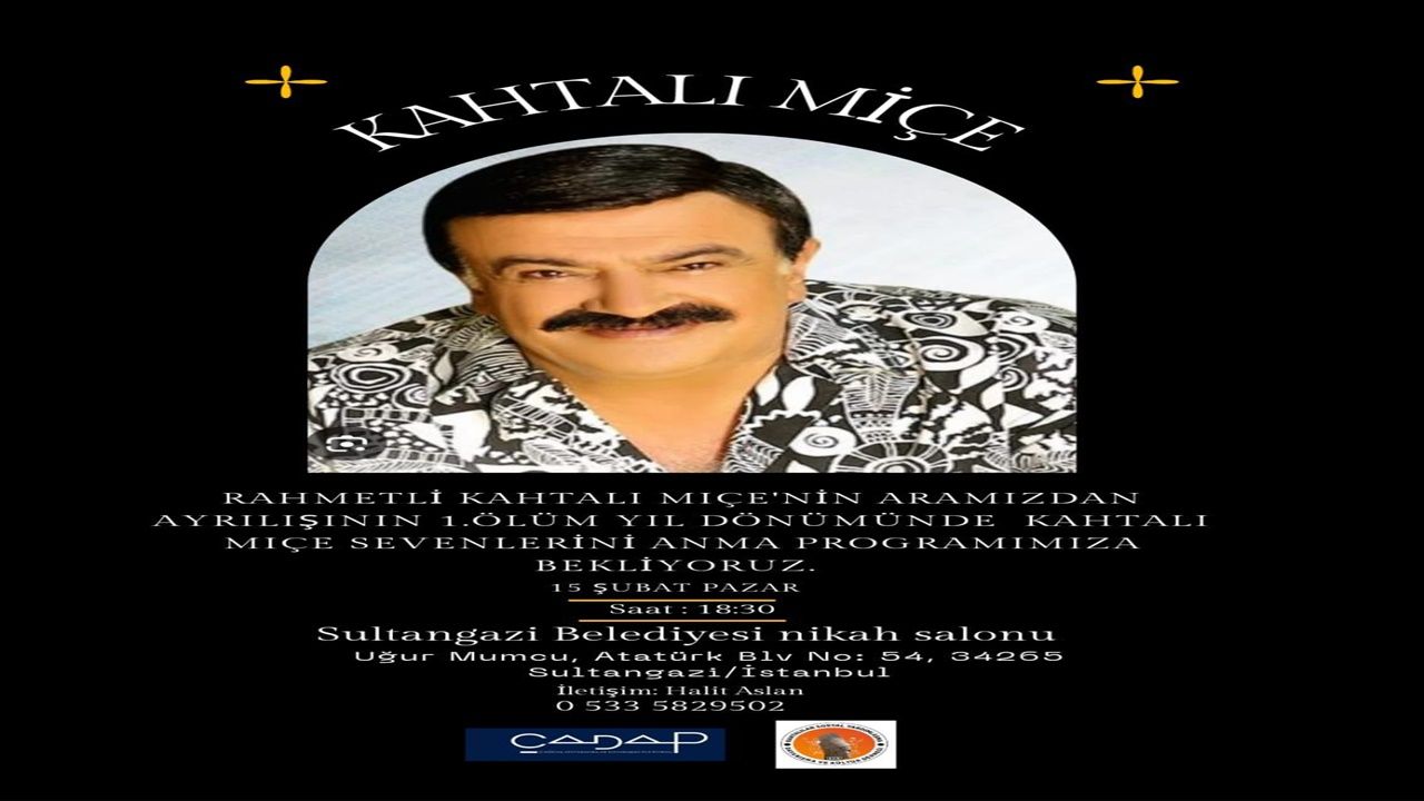 Türk Halk Müziği'nin usta isimlerinden Kahtalı Mıçe, vefatının 1.yılında İstanbul’da gerçekleştirilecek programla anılacak. Çağdaş Adıyamanlılar Derneği (ÇADAP) ve Kahtalılar Derneği tarafından organize edilen program, 15 Şubat 2026 Salı günü saat 18.30'da Sultangazi Belediyesi Nikah ve Düğün Sarayında gerçekleştirilecek.