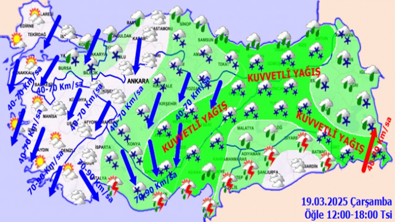 Rüzgarın, Marmara, Ege ve Orta Karadeniz ile İç Anadolu'nun güney ve batısı ile Doğu Anadolu'nun güneydoğusunda kuvvetli (40-70 km/sa), Akdeniz'de yer yer kısa süreli fırtına (70-90 km/sa) şeklinde esmesi beklendiğinden meydana gelebilecek olumsuzluklara karşı dikkatli ve tedbirli olunması gerekmektedir.
